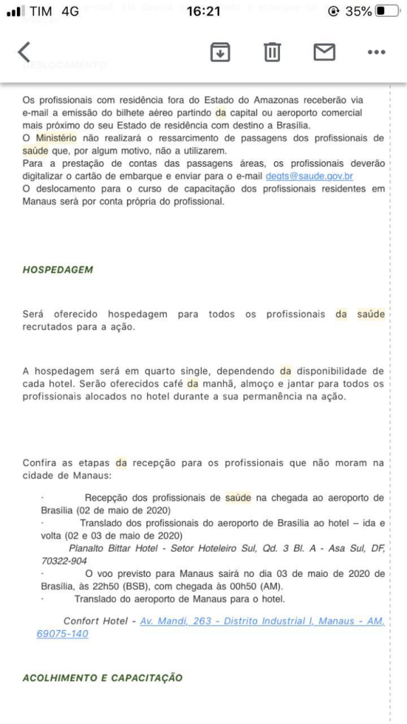 No início de maio vários profissionais de todos os locais do Brasil foram recrutados por meio de e-mails e ligações pelo DGTS (Departamento de Gestão do Trabalho em Saúde) do Ministério da Saúde para o combate ao COVID-19 no Estado do Amazonas.