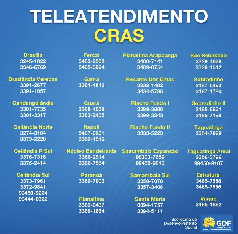 Como medida de segurança por causa da pandemia do novo coronavírus, a Sedes suspendeu temporariamente o atendimento presencial nas 61 unidades socioassistenciais de gestão direta do governo distrital. A medida, porém, não interrompeu o trabalho das equipes, que continuam orientando as famílias de baixa renda e mantêm o contato frequente com os usuários, tanto por telefone quanto por grupos de WhatsApp.