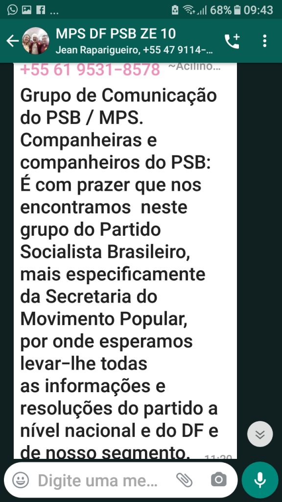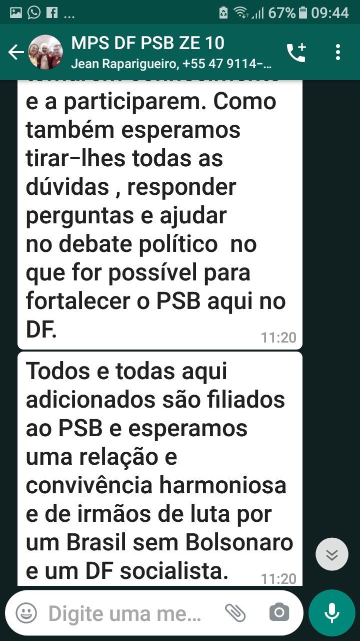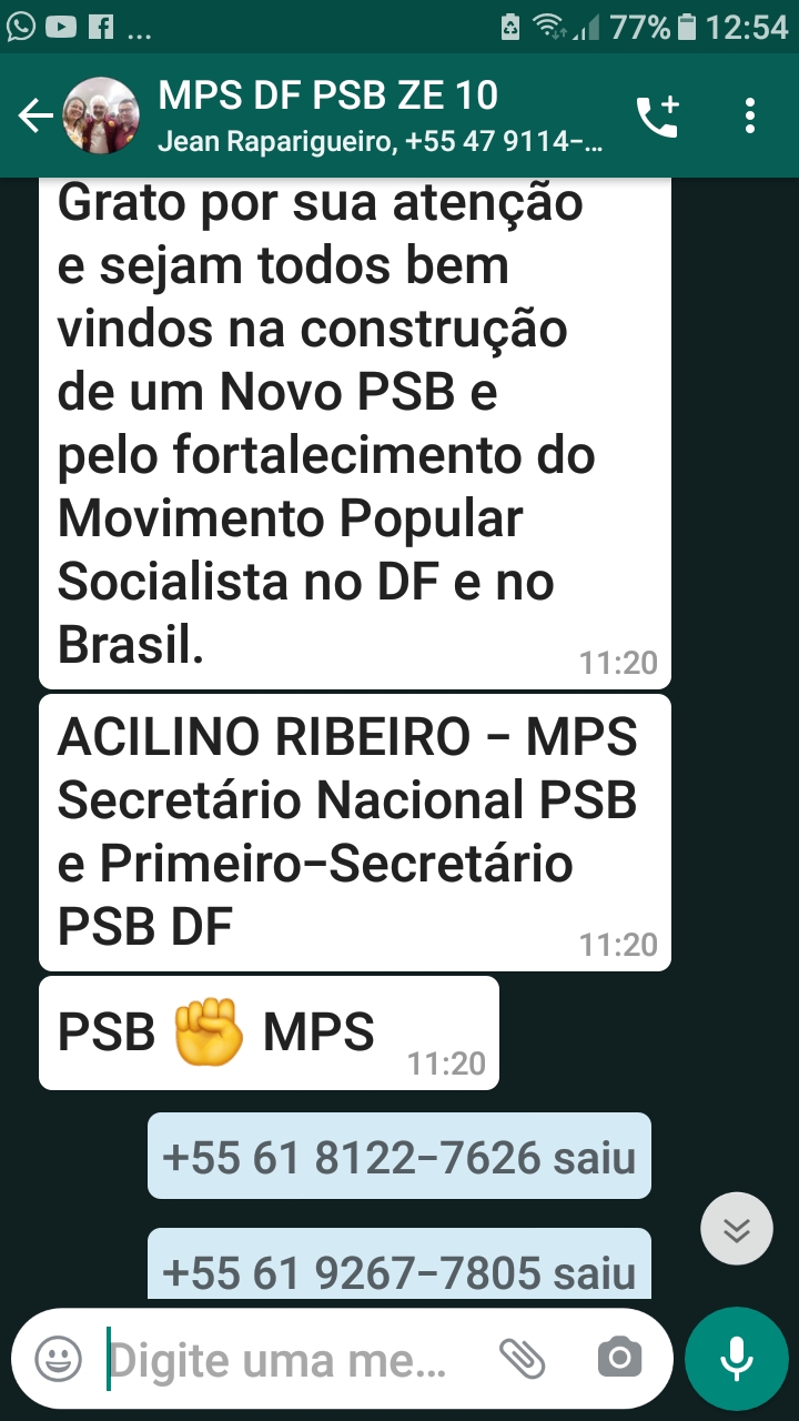 Se os planos do Partido Socialista Brasileiro (PSB), para as próximas eleições depender do grupo criado por seu secretário nacional, Acilino Ribeiro, com a proposta de “CURSOS de FORMAÇÃO POLÍTICA”, diga-se, lavagem cerebral, a resposta já foi dada na debandada geral no grupo de WhatsApp – MPS DF PSB ZE 10 – criado, ontem (01/08), com quase duzentos (200) participante, ficando apenas com quarenta e um (41), um dia após a sua criação.