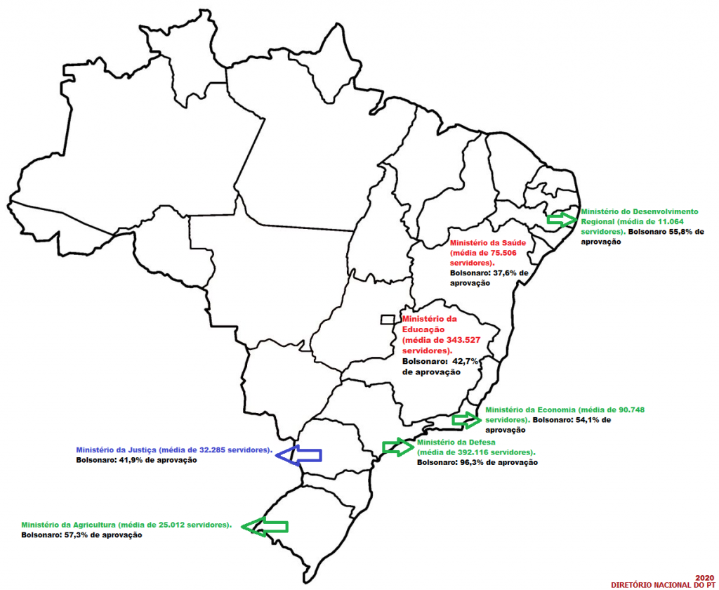 O site recebeu de uma fonte de São Paulo, um mapa atribuído ao Partido dos trabalhadores (PT), que, estranhamente utiliza-se de algumas Unidades da Federação como Ministérios, com dados de aprovação do presidente Jair Bolsonaro (sem partido) entre os servidores públicos federais.
