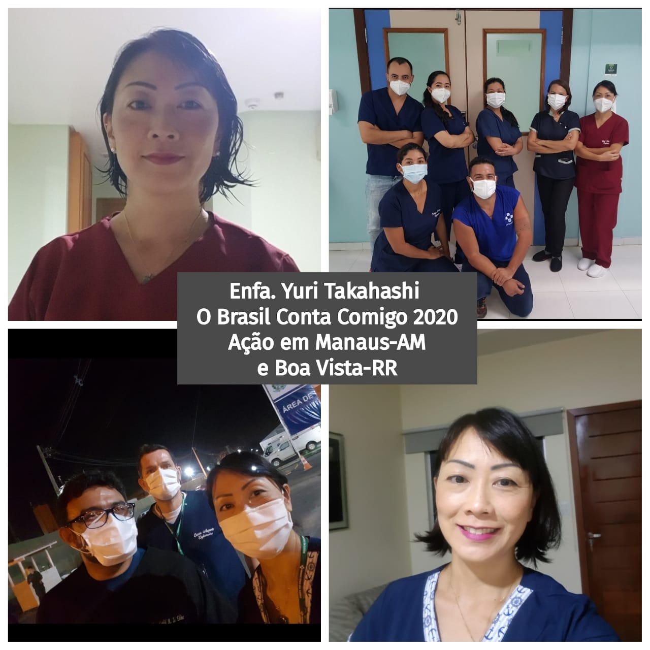 Yuri Takahashi, de 44 anos, é natural de Anápolis/GO, reside em Brasília/DF, foi uma das primeiras profissionais que chegaram em Manaus-AM em 04/05/20, na Ação estratégica Brasil Conta Comigo, do Ministério da Saúde. Mãe de 2 filhos, deixou esposo e filhos para somar esforços na linha de frente do combate ao COVID-19 nos hospitais de campanha de Manaus.