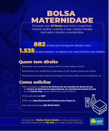 A Bolsa Maternidade é voltada a famílias em situação de vulnerabilidade, com renda per capita inferior a meio salário mínimo, inscritas no programa Criança Feliz Brasiliense, ou em situação de rua.