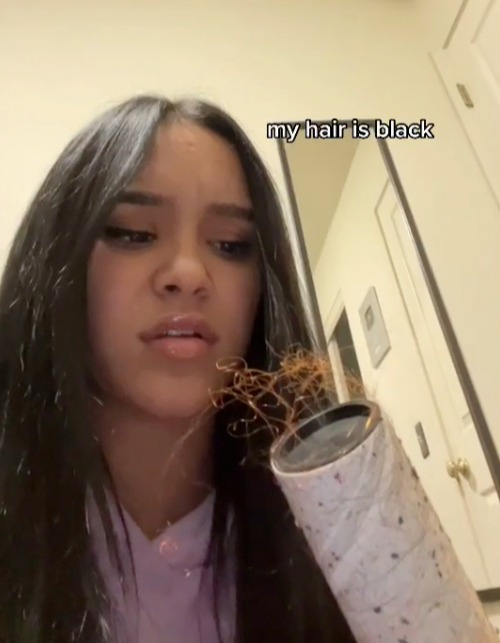 Fazendo uma pausa, ela diz “wtf” antes de apontar que seu cabelo é preto.