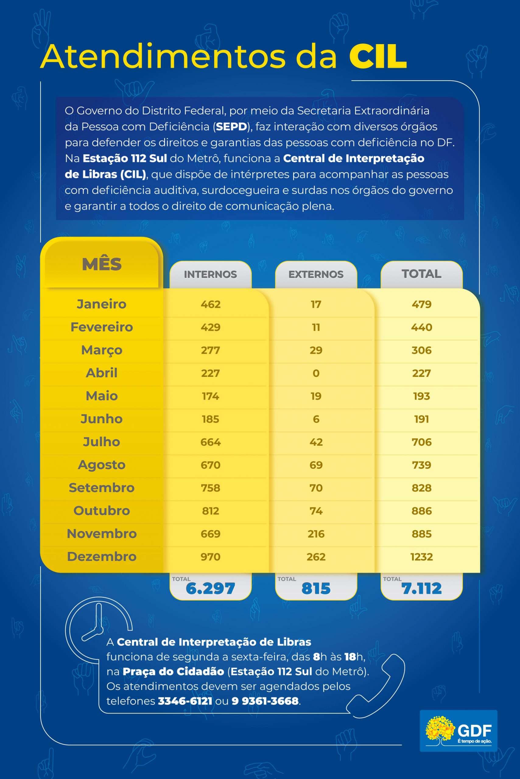 Em maio do ano passado, a CIL foi transferida da Secretaria de Justiça e Cidadania (Sejus) para a SEPD, o que aumentou a força de trabalho e atendimento da central. Em julho, a central ganhou um carro exclusivo para transportar os surdos e os intérpretes, o que aumentou em mais de 1.000% a quantidade de atendimentos externos realizados em dezembro (262) em relação a janeiro (17).