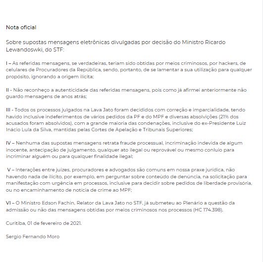 Moro: “Sobre as supostas mensagens obtidas por meios criminosos nas incessantes tentativas de anular condenações por crimes de corrupção:”