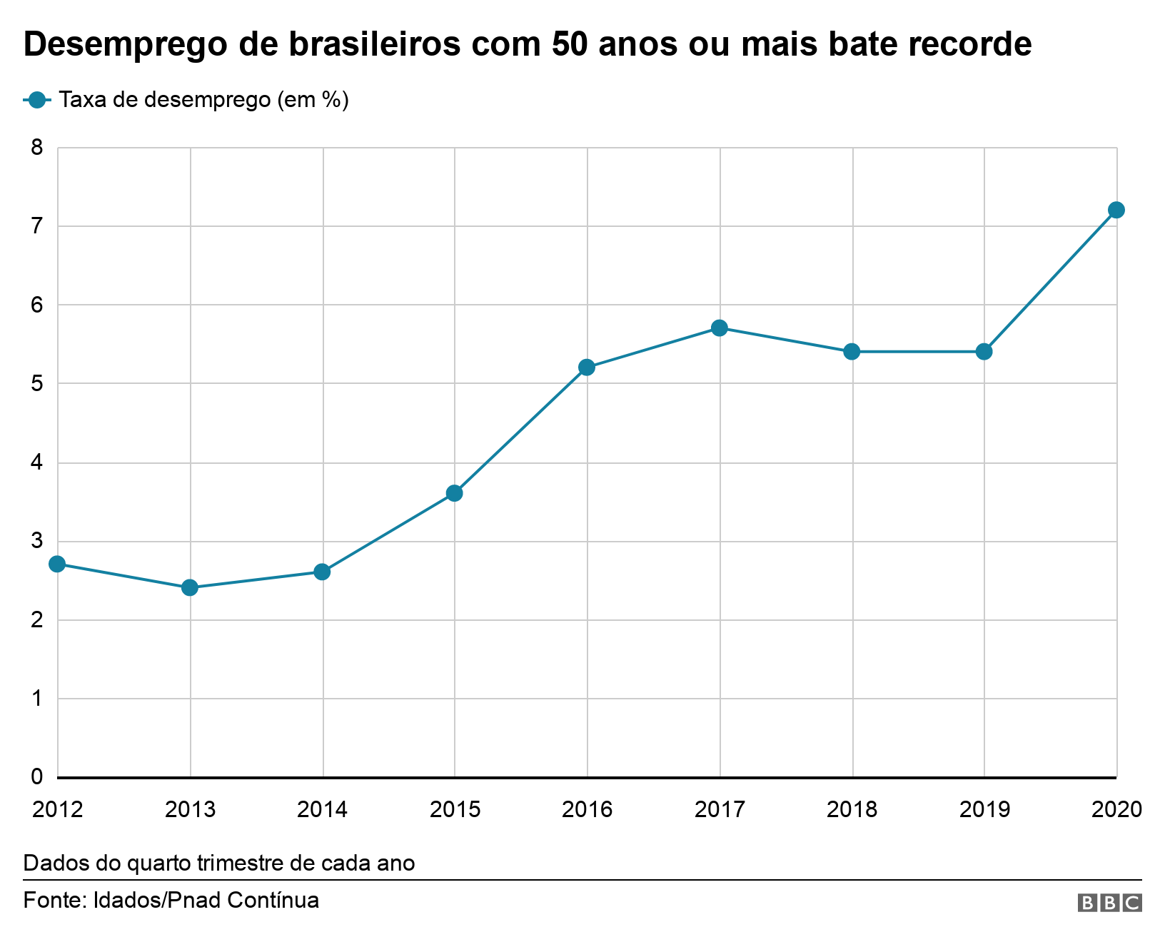 Se for considerado o aumento da taxa desde 2012, quando tem início a série histórica, a alta do desemprego foi proporcionalmente maior para o grupo de 50 anos ou mais, segundo levantamento do IDados feito a pedido da BBC News Brasil com base na Pnad Contínua (veja mais dados abaixo). Em 2020, ano que surgiu a pandemia de coronavírus, a taxa de desemprego para esta faixa etária superou 7% pela primeira vez.