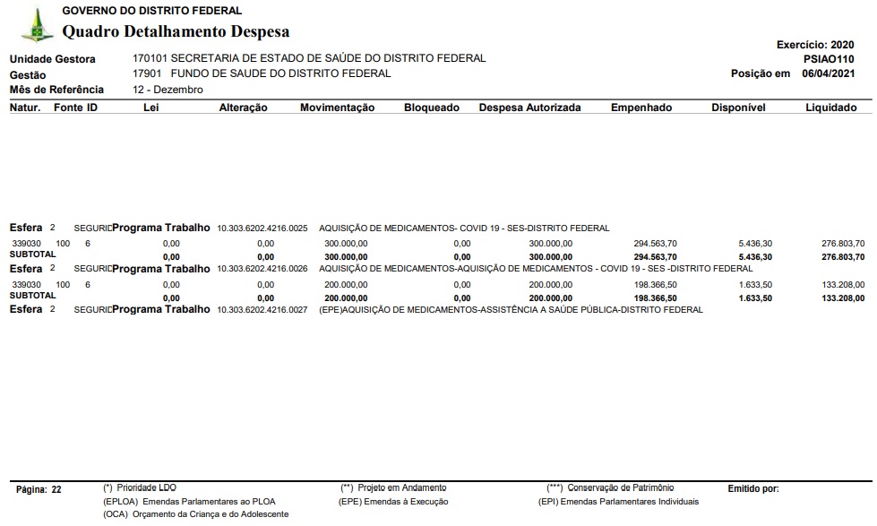 Levantamento do portal S&DS, no Quadro de Detalhamento Despesa (QDD), mostra que a aquisição desses medicamentos (diversos) em 2020, para combate a pandemia da Covid-19 no DF, pela Secretaria de Saúde do Distrito Federal (SES-DF), com montante total de (R$ 500 mil) em despesa autoriza teve (R$ 410 mil) liquidados com os produtos farmacêuticos.