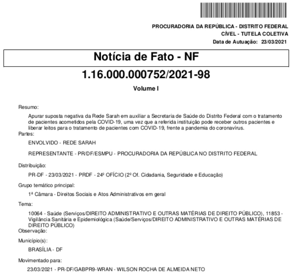 A mesma requereu informações sobre a situação do Sarah de se eximir-se em receber pacientes portadores do Coronavírus, quando todos os hospitais públicos, particulares e Organizações Sociais (OS) estão ajudando no enfrentamento da pandemia, uma vez que sua unidade recebe milhões de reais por ano em verbas públicas federais.