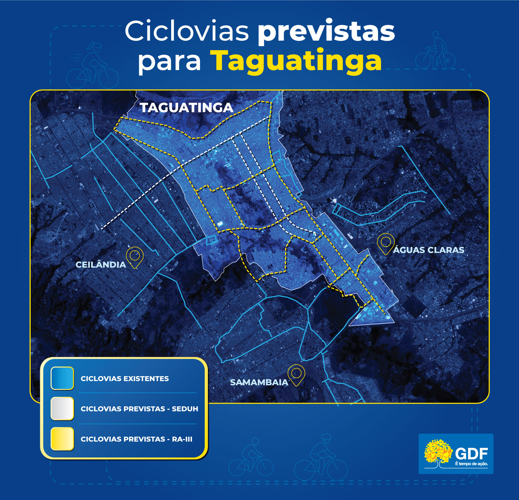 Taguatinga vai ganhar a primeira ciclovia e será grandiosa. Serão 44 quilômetros de pista conectando os mais de 20 setores da cidade – do Pistão Sul ao Norte, passando pelo Setor M Norte e QNL, até o setor Primavera. Antiga demanda da comunidade local, o projeto já está no papel e deve custar R$ 40 milhões.