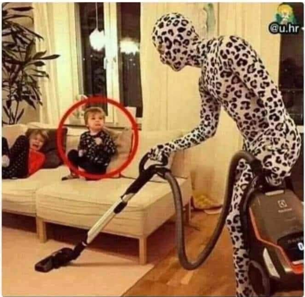 A imagem viral mostra a mãe vestida com uma fantasia de leopardo enquanto passa o aspirador – seus filhos estão claramente apavorados.