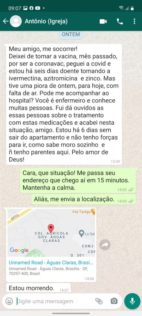 “Estava almoçando neste horário, não tive como socorrê-lo antes. Ao visualizar a mensagem fiquei pasmo, pedi que ele me enviasse o endereço, comuniquei minha esposa, deixei-a em casa e segui para o apartamento dele. Chegando lá, vi um homem bastante debilitado com muita dificuldade respiratória. Imediatamente, peguei-o e nos direcionamos para o hospital.”
