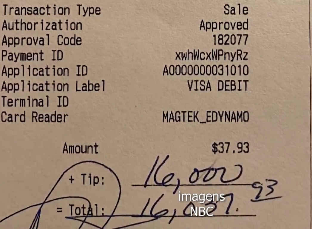 Um cliente que pediu alguns cachorros-quentes, fritas temperadas e bebidas em um restaurante de New Hampshire deixou uma enorme gorjeta – US$ 16 mil (cerca de R$ 79.500).