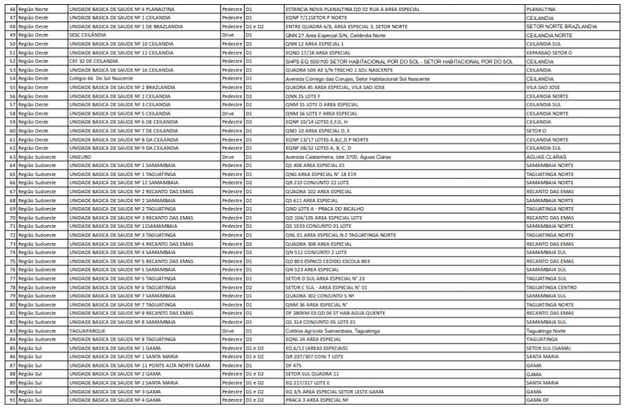 O Distrito Federal vai disponibilizar mais de 100 mil doses da vacina contra a covid-19 para imunizar a população neste fim de semana, entre os dias 23 e 25. O público-alvo do mutirão são pessoas acima de 37 anos, que, conforme anunciado no decorrer da semana, não precisam fazer o agendamento prévio. A seguir, você confere como será o funcionamento da vacinação, bem como os postos disponíveis para quem vai tomar a primeira ou segunda dose da vacina.