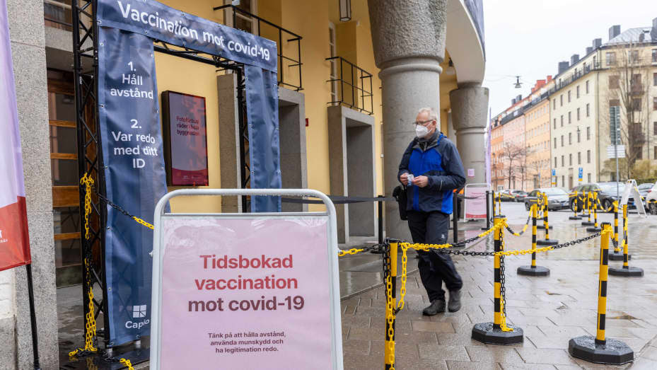 Um homem entra em um centro de vacinação Covid-19 em Estocolmo, Suécia, em 6 de maio de 2021.Wei Xuechao | Xinhua | Getty Images