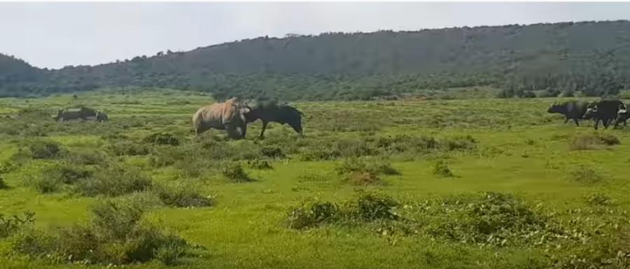 Imagens incríveis mostram um búfalo se separando da matilha e confrontando o macho, enfrentando um rinoceronte de 2,5 toneladas em um teste de força aparentemente imprudente.