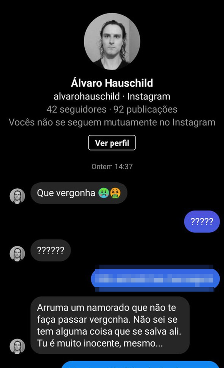 Em mensagens enviadas à namorada de Jota Júnior, Álvaro Hauschild questiona relacionamento do casal, diz que negro ‘tem um cérebro programado para fazer o máximo de filhos que puder’ e que ‘pode não ser um problema lá onde a natureza dá cabo deles’