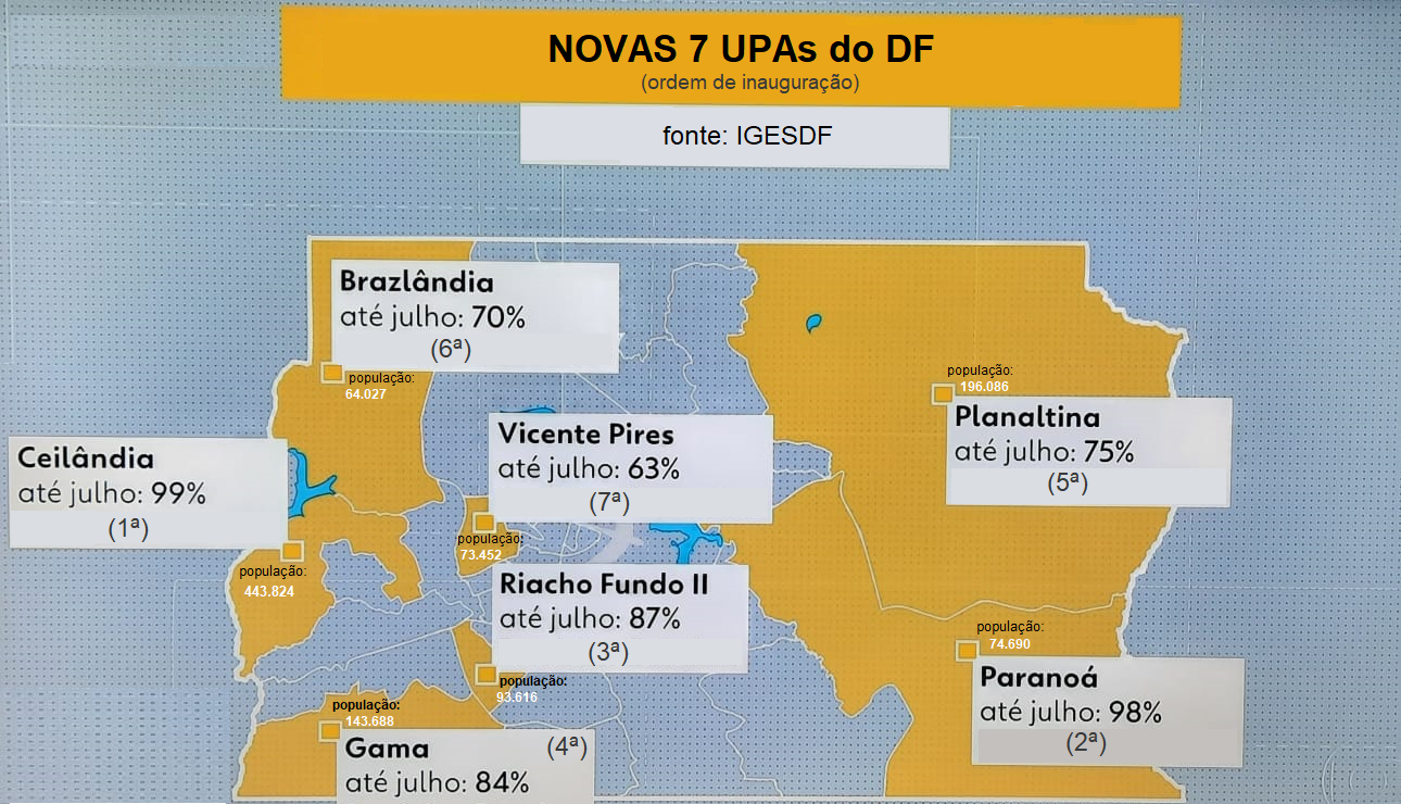 “Com essas nove UPAs, chegaremos a 40 mil atendimentos. Isso é um projeto nosso de reforço na saúde. Fizemos em três anos muito mais do que foi feito em 20 anos. Teremos mais UBSs para reforçar a Atenção Básica; nosso projeto para a saúde foi abalado pela pandemia, mas a gente segue firme no sentido de colocar à população do DF a melhor saúde possível.”