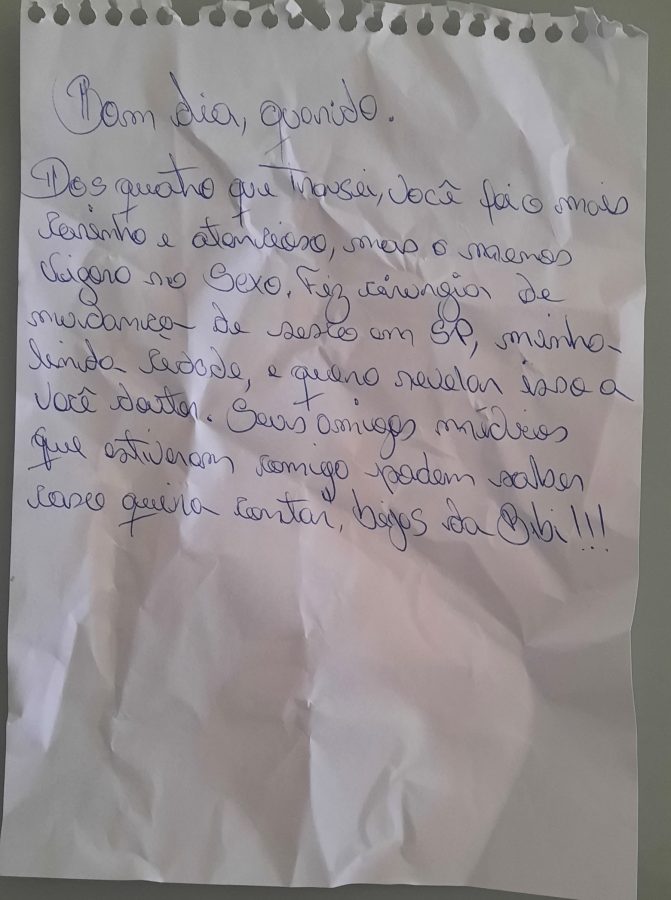 Veja o teor do bilhete deixado para os médicos: “Dos quatro que transei, você foi o mais carinho e atencioso, mas o menos vigoroso no sexo. Fiz cirurgia de mudança de sexo em São Paulo, minha linda cidade, e quero revelar isso a você doutor. Seus amigos médicos que estiveram comigo podem saber caso queira contar”, beijos da Bibi!!.