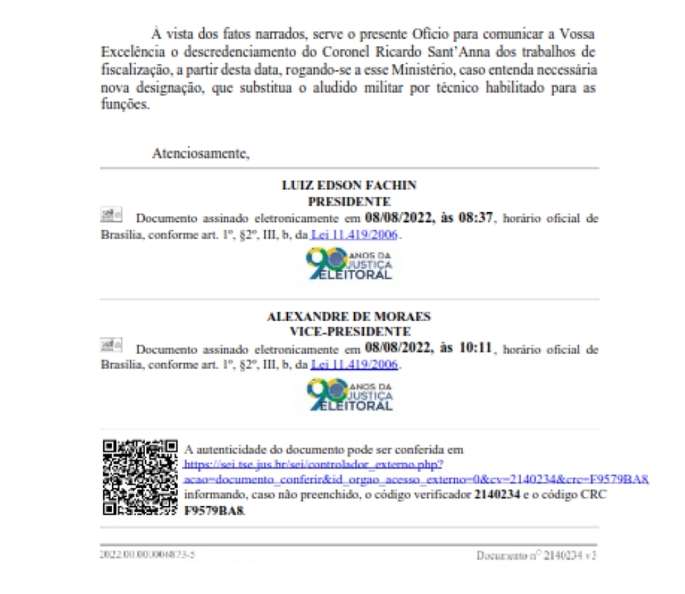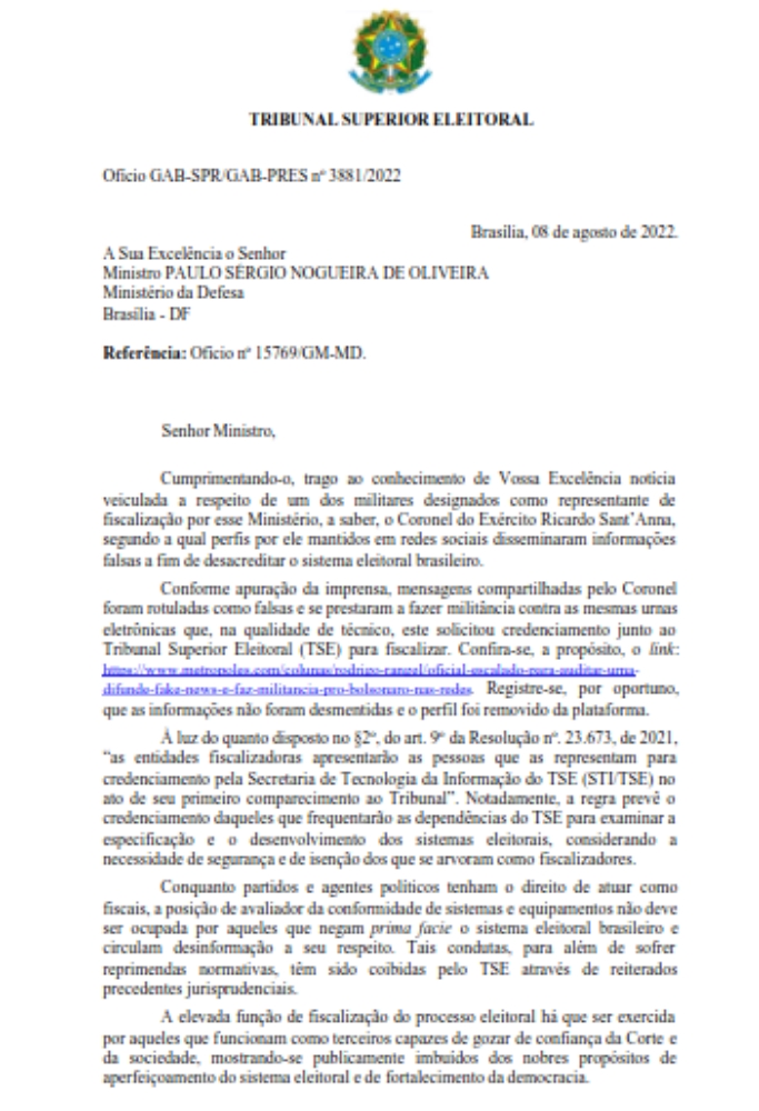 A decisão foi comunicada pelo Ofício nº 15769/GM-MD subscrita ao ministro da Defesa, Paulo Sérgio Nogueira, pelo presidente do TSE, ministro Edson Fachin, e pelo vice-presidente do tribunal, Alexandre de Moraes.