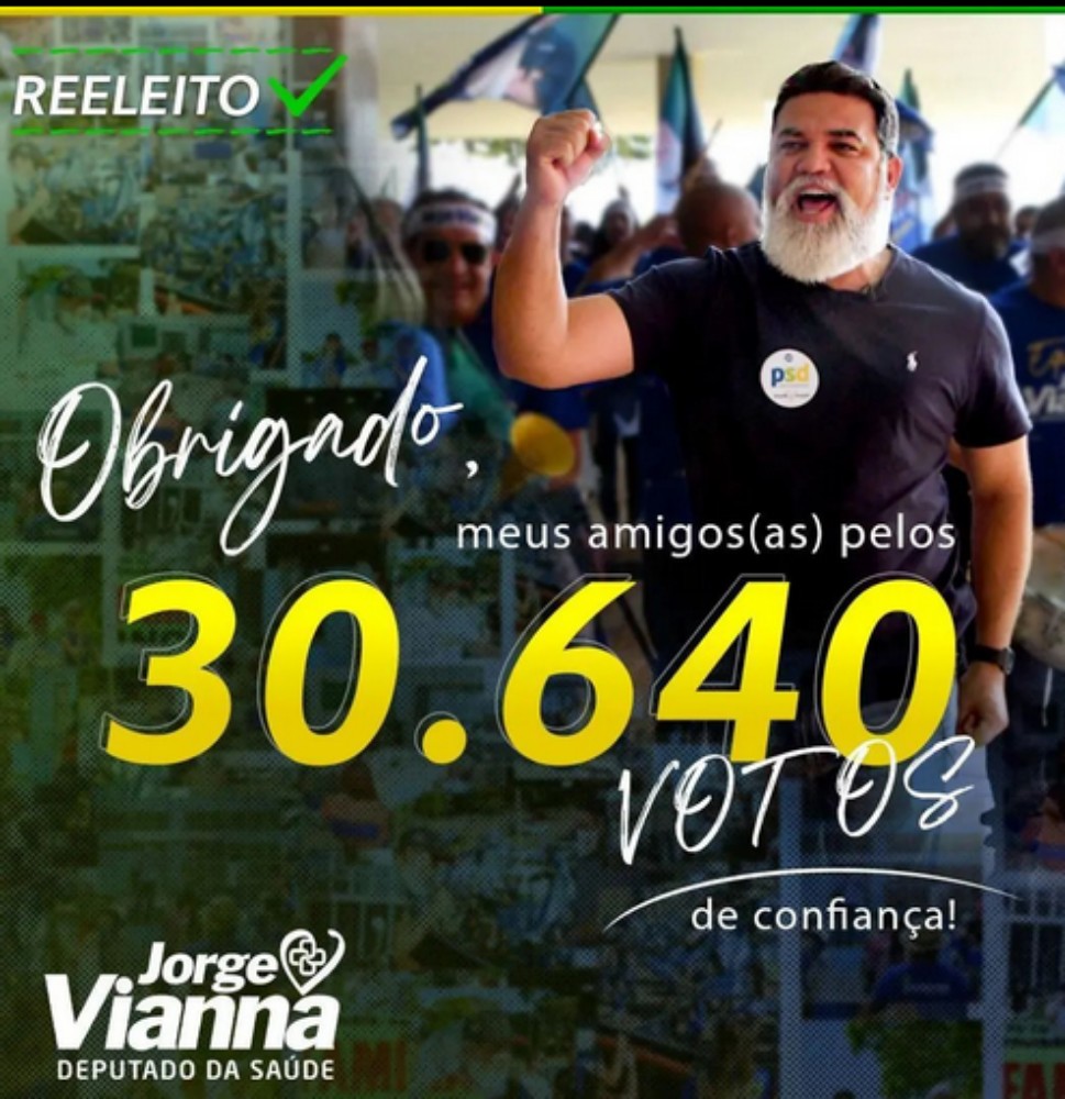 Jorge Vianna é deputado distrital reeleito com 30.640 votos, para o segundo mandato, pelo PSD, sua trajetória como parlamentar começou 1º de Janeiro de 2019. Como técnico em enfermagem na SES-DF trabalhou nos Hospitais do Paranoá e Samambaia, e ainda no Serviço de Atendimento Móvel de Urgência – SAMU, onde se formou como instrutor. Como presidente do Sindate-DF, Vianna denunciou diversas irregularidades à imprensa e aos órgãos competentes quanto aos erros e inconstâncias encontradas dentro dos hospitais públicos, que prejudicavam à população.