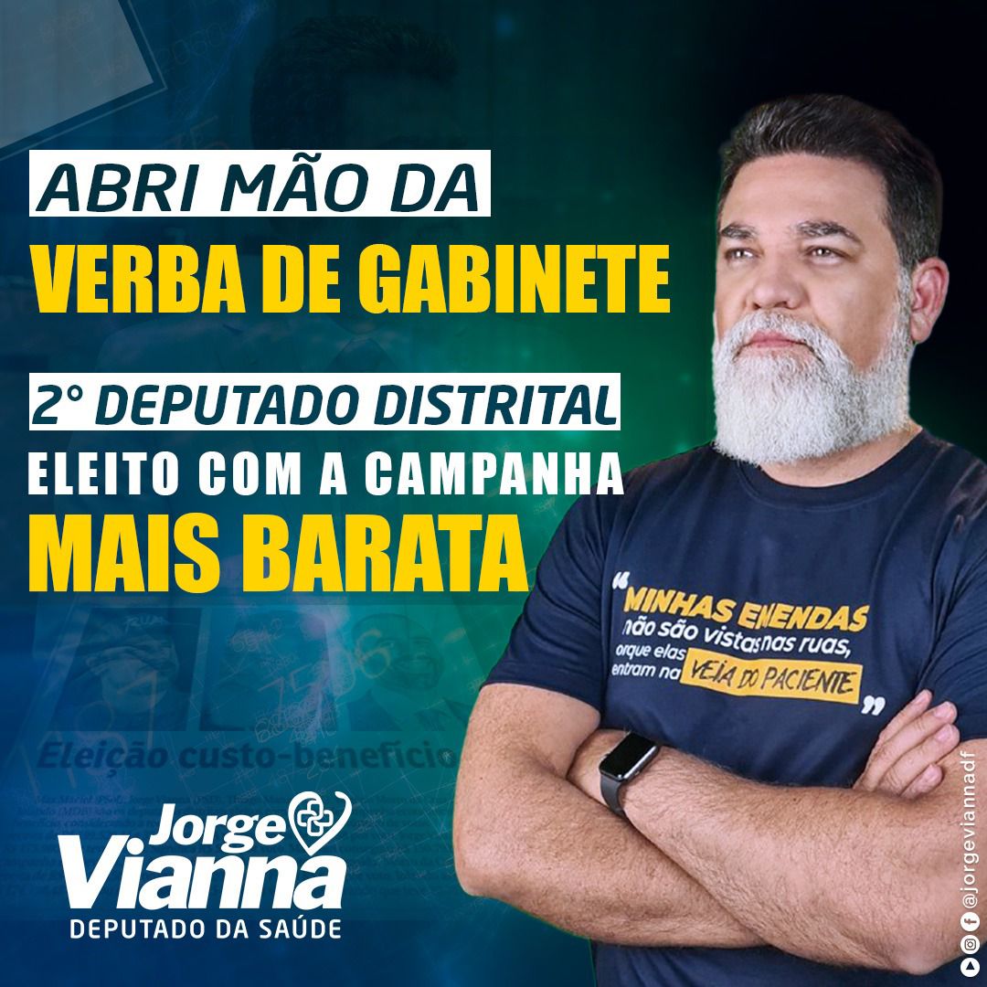 O deputado Jorge Vianna (PSD), foi reeleito nas Eleições 2022, para o seu segundo mandato na Câmara Legislativa do Distrito Federal (CLDF). Vianna foi o segundo candidato distrital eleito com melhor desempenho econômico, tendo uma das campanhas mais baratas.