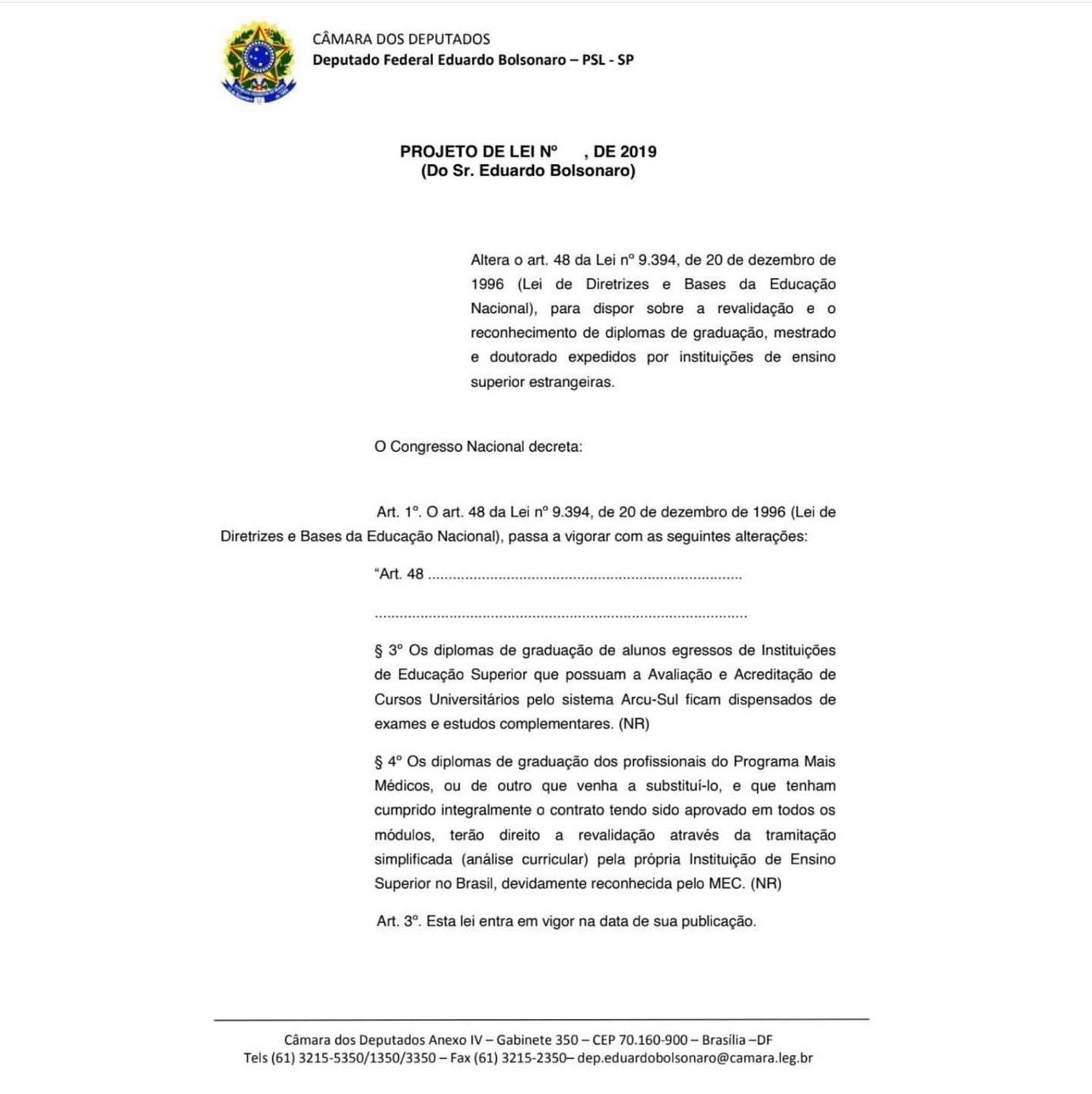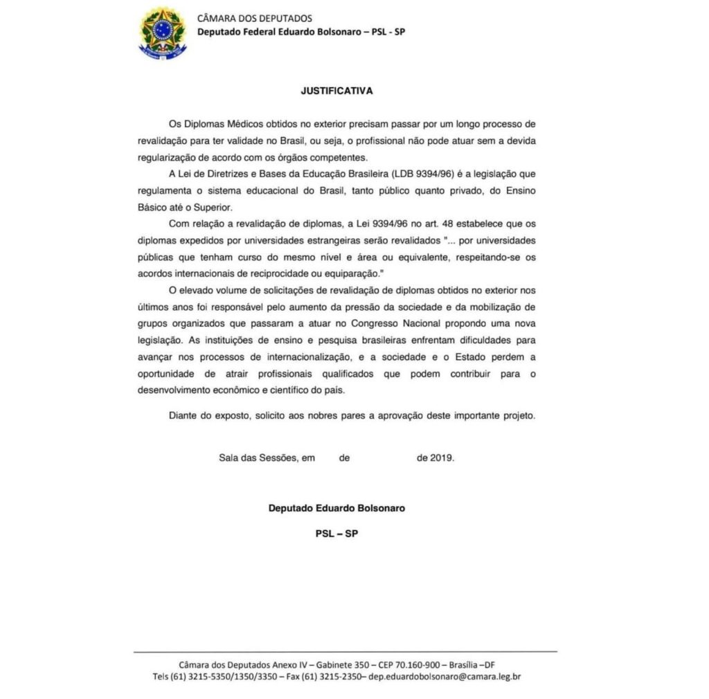 Eduardo Bolsonaro entende que os diplomas estrangeiros de todos aqueles que participaram do Programa Mais Médicos e foram aprovados nas inúmeras avaliações seriadas mensais, assim como concluíram o programa de pós-graduação e atenderam à população com qualidade devem ser revalidados pelo processo simplificado de revalidação.