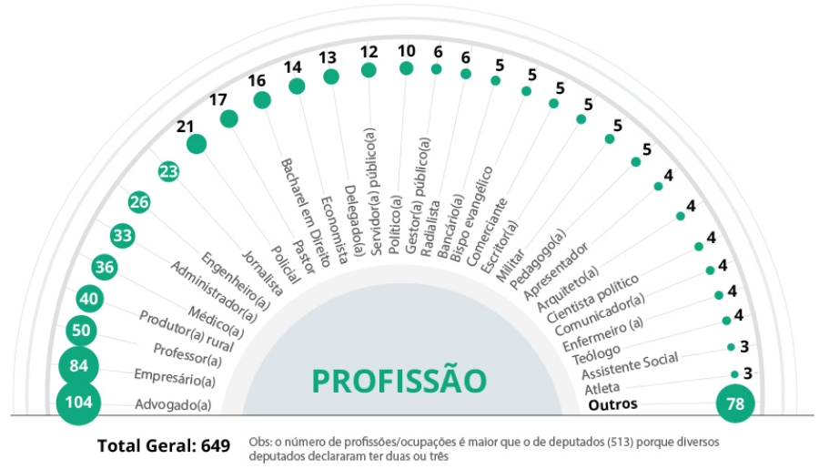 Muitos eleitos declararam duas ou três profissões/ocupações, de modo que estas somam 649 –número superior ao de deputados, que é 513.
