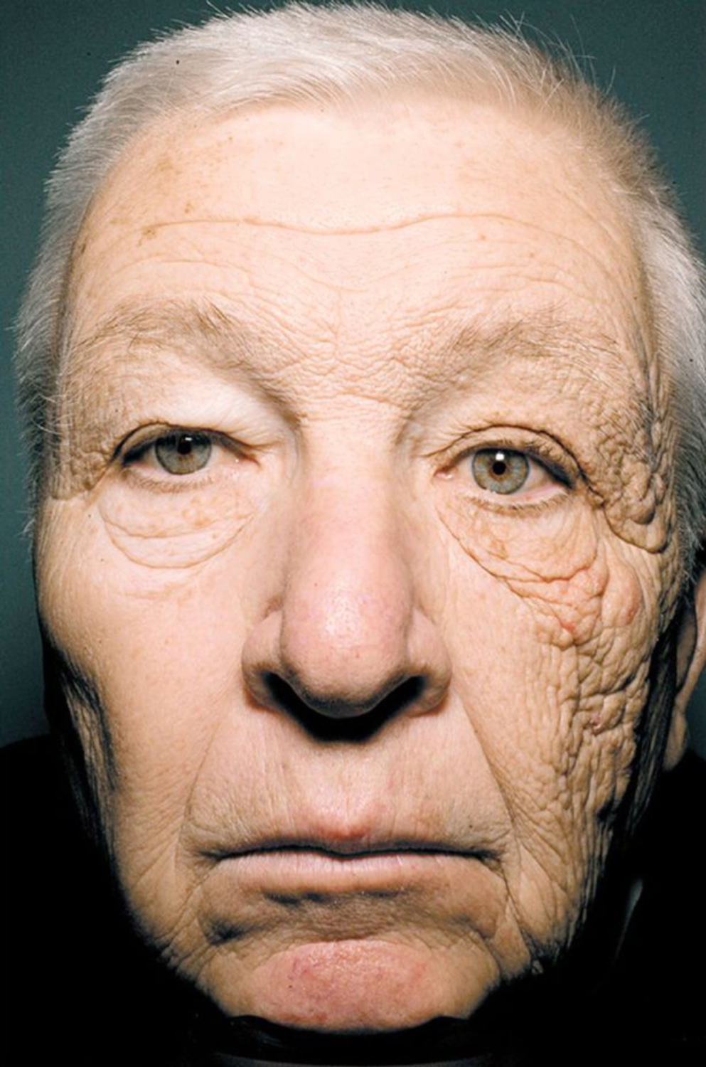 A pele do lado danificado de seu rosto gradualmente engrossou devido à exposição ao sol, em um processo conhecido como dermatoeliose unilateral.