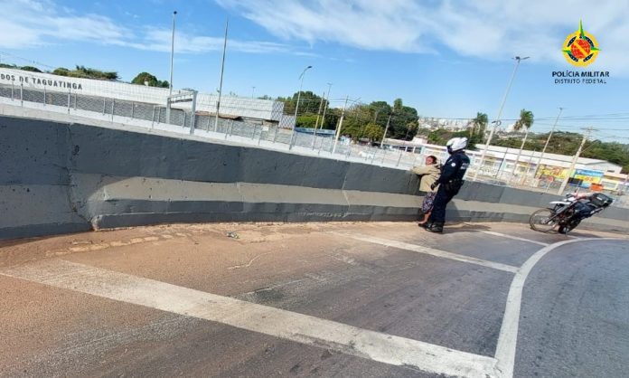 Na manhã deste domingo (30), uma equipe de motociclistas do 2º Batalhão da PMDF realizava patrulhamento no Viaduto do túnel Rei Pelé, quando, durante a saída no sentido de Ceilândia, depararam-se com uma situação de extrema urgência. Uma mulher, aparentando ter cerca de 40 anos, tentava subir na mureta que dá acesso ao túnel, dando indícios de uma possível tentativa de suicídio.