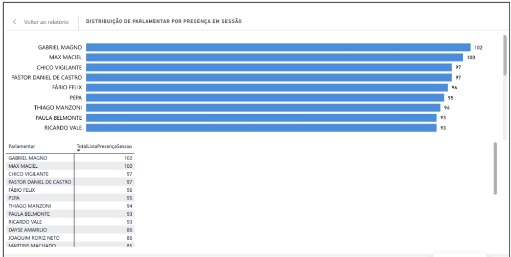 - Max Maciel (PSOL) apresentou um total de 100 presenças em 106 sessões, correspondendo a uma média de aproximadamente 94,34% de presença no Plenário.