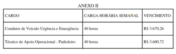 - Para a especialidade de Condutor de Veículo de Urgência e Emergência, estão disponível 50 vagas de 40 horas semanais.