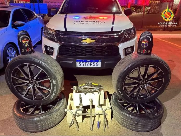 Dois homens e uma mulher foram detidos pelos policiais militares do Grupo Tático Operacional do 25º Batalhão (Gtop 45) após roubarem rodas de um veículo no Núcleo Bandeirante na madrugada deste sábado (22). Uma testemunha comunicou o furto na 3ª Avenida e passou a placa do carro usado pelos meliantes para os policiais.