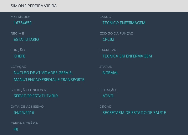 Simone Pereira Vieira foi aposentada por invalidez no cargo de Técnico em Atividades Médico-Hospitalares, especialidade Técnico em Enfermagem, do HFA, conforme portaria publicada no Diário Oficial da União em 30 de dezembro de 2022. No entanto, desde 4 de maio de 2016, ela ocupa um cargo público ativo na SES-DF como Técnico em Saúde, especialidade Técnico em Enfermagem.