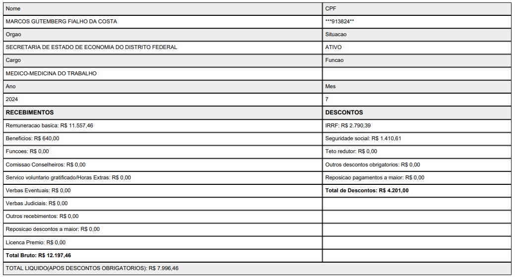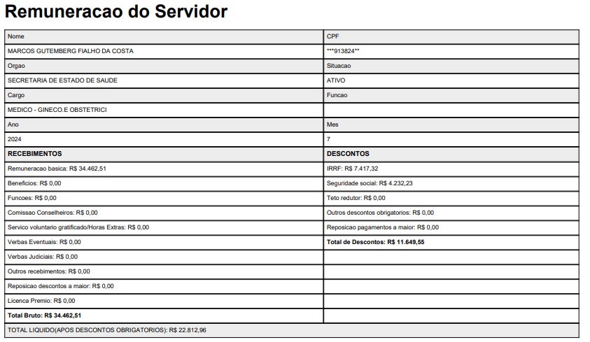 A distribuição dos vencimentos de Fialho é dividida da seguinte forma: ele recebe R$ 12.197,46 brutos pela matrícula de 20 horas como médico do trabalho, e R$ 34.462,51 brutos pela matrícula de 40 horas como ginecologista e obstetra.