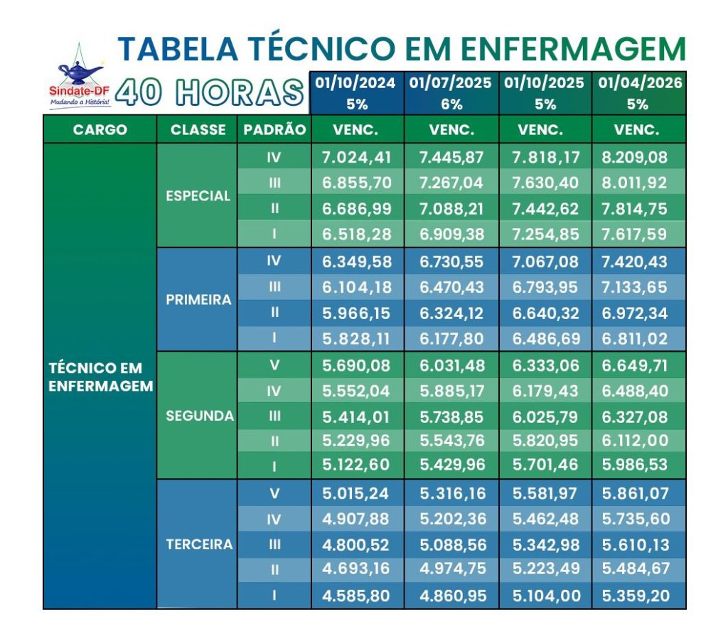 A tabela publicada já reflete a redução de padrão de 25 para 18 anos, bem como os reajustes de 15% + 6%.