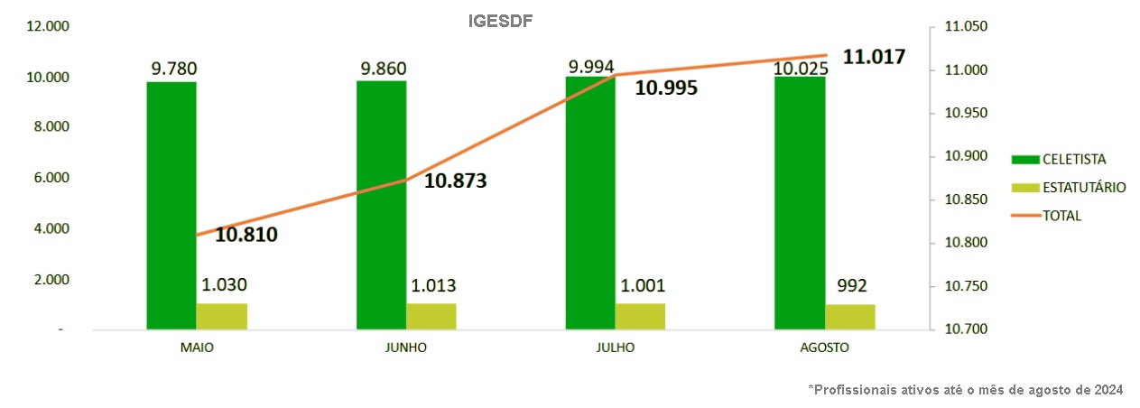 O (IGES-DF) Instituto de Gestão Estratégica de Saúde do Distrito Federal conta atualmente com 11.017 colaboradores, sendo 10.025 celetistas e 992 estatutários. A força de trabalho apresenta uma predominância feminina, com 73,4% de mulheres, enquanto os homens representam 26,6%.
