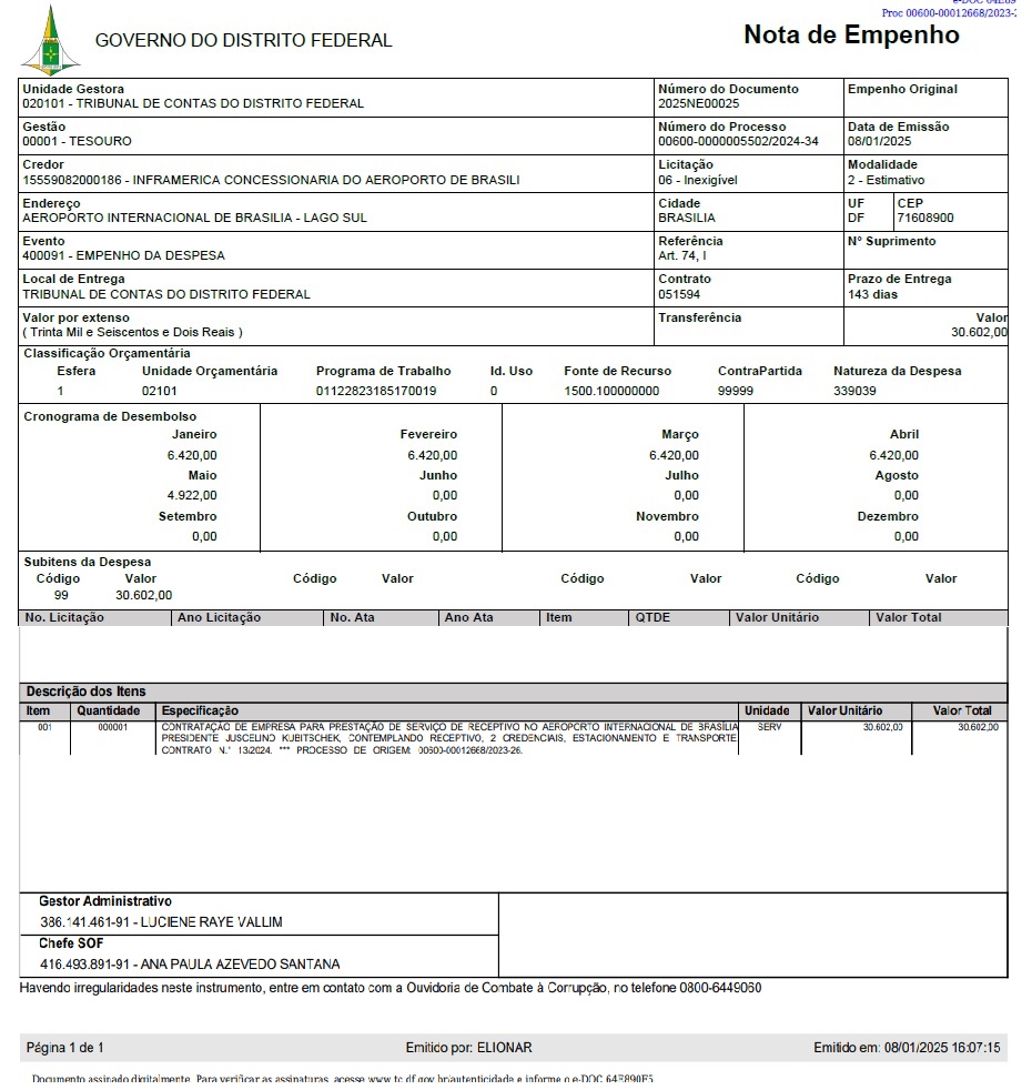 O Tribunal de Contas do Distrito Federal [TCDF] destinou R$ 77.040,00 para contratar um serviço de receptivo exclusivo no Aeroporto Internacional de Brasília, Presidente Juscelino Kubitschek, beneficiando membros do próprio tribunal, do Ministério Público de Contas [MPC] e autoridades externas.