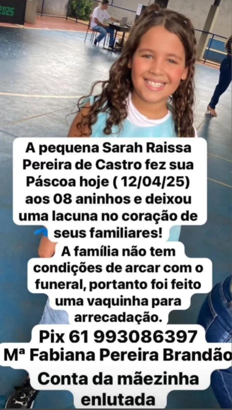 Segundo a corporação, a criança, identificada como Sarah Raissa Pereira de Castro, foi internada no Hospital Regional de Ceilândia (HRC) no dia 10 de abril, após sofrer uma parada cardiorrespiratória. Apesar das tentativas de reanimação, que duraram cerca de 60 minutos, ela não apresentou reflexos. A morte cerebral foi confirmada no mesmo dia, e o óbito foi declarado oficialmente no domingo (13).
