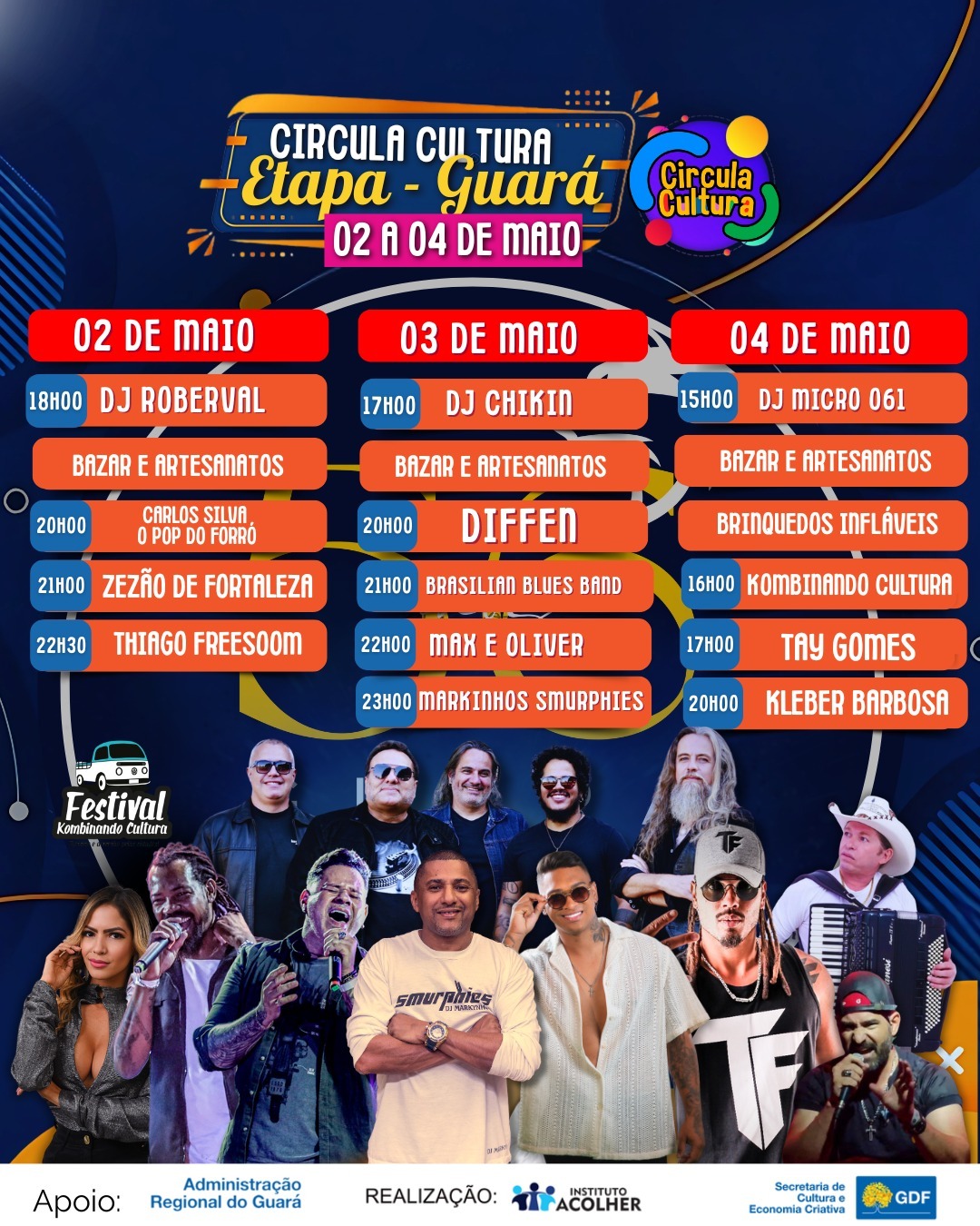 Idealizado pelo Instituto Acolher, em parceria com a Secretaria de Cultura e Economia Criativa do DF, o Circula Cultura percorre 18 regiões administrativas levando música, arte, lazer e estímulo à economia criativa. A edição do Guará promete ser uma das mais animadas: forró, blues, hip hop, DJs, manifestações da cultura popular e atrações voltadas especialmente para o público infantil estão entre os destaques.