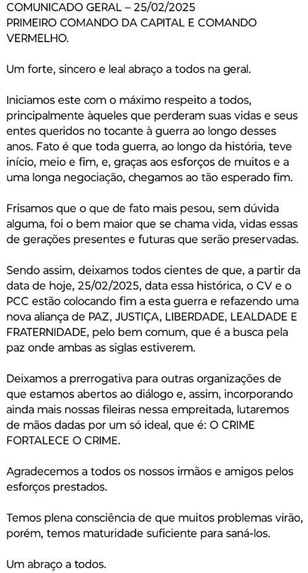 O Ministério Público de São Paulo [MPSP] confirmou a autenticidade dos comunicados e apontou que as mensagens circularam amplamente nas redes sociais, alcançando membros das organizações em diversos estados.