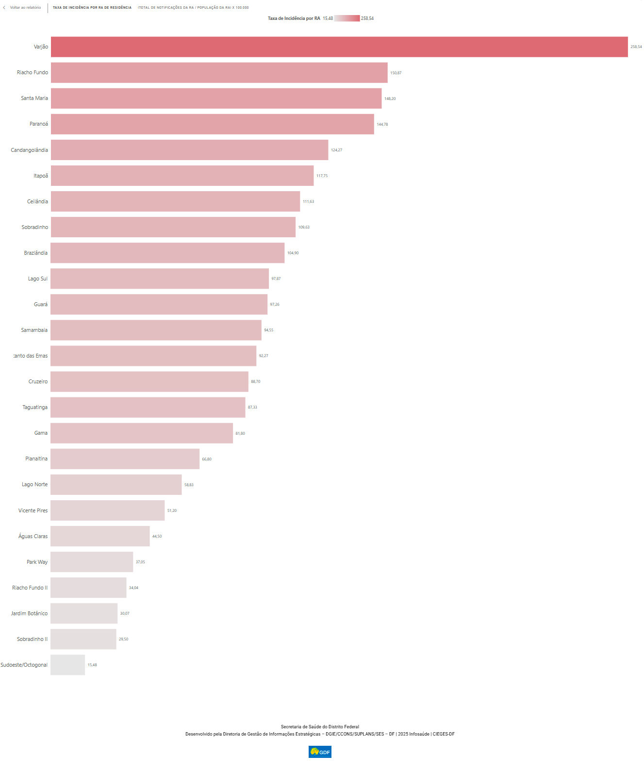 Estas regiões apresentam um volume de casos proporcionalmente muito maior em comparação com a média do DF, exigindo uma investigação aprofundada das causas e uma possível intensificação das medidas de controle.