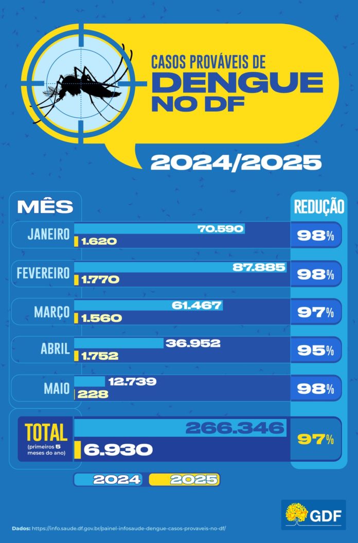 A queda está registrada no Portal de Informações da Saúde do DF (InfoSaúde-DF), que aponta a diminuição nos primeiros meses de 2025 em comparação com os do ano passado. Entre janeiro e maio de 2024, foram registrados 266.346 casos prováveis de dengue, ao passo que em 2025, até o momento, foram 6.930 casos – uma redução de aproximadamente 97% do valor.