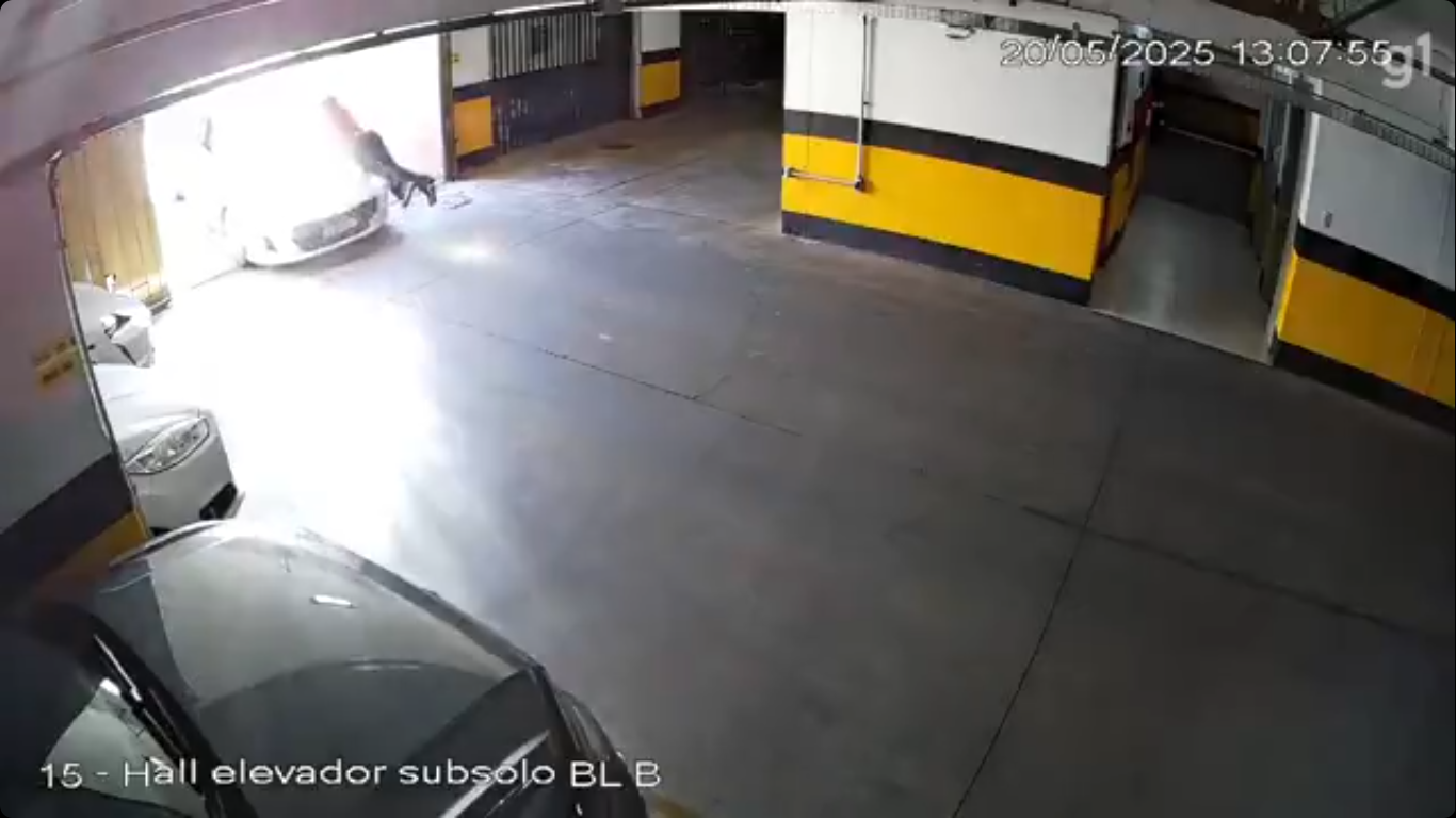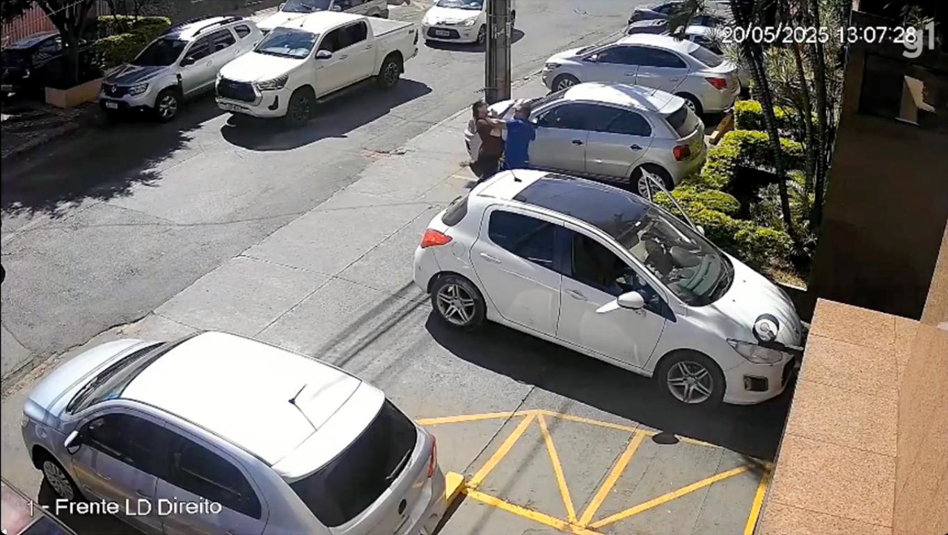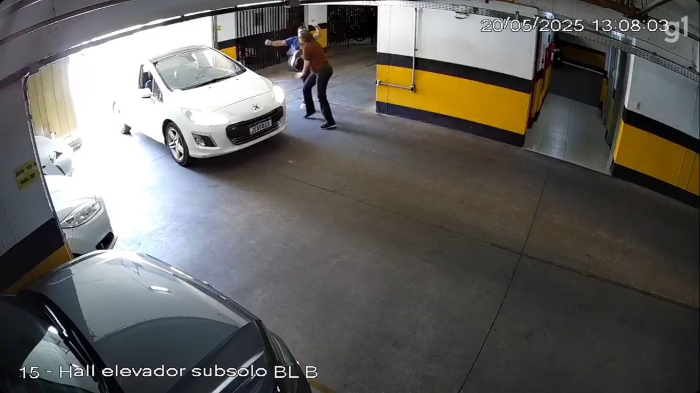 As imagens mostram que a mulher, identificada como Karla Cristina, demonstrou comportamento agressivo desde o início. Ela estaciona o carro e atravessa a rua em direção ao veículo do policial, identificado como o sargento Antônio Haroldo Camelo da Silva, 56, que já havia parado em frente à garagem de seu prédio.