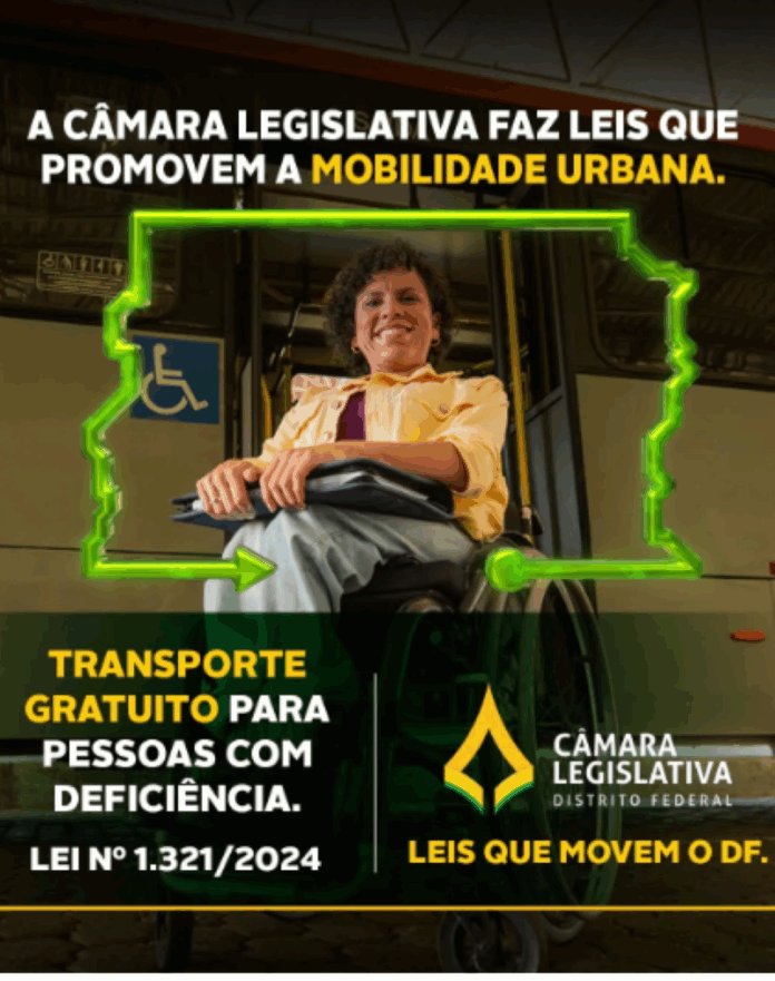 A Câmara Legislativa do Distrito Federal [CLDF] iniciou neste mês a veiculação da campanha publicitária “Leis que Movem o DF”, com o objetivo de divulgar ações legislativas relacionadas à mobilidade urbana. Um dos destaques das peças — exibidas em ônibus, redes sociais e na TV Câmara Distrital — é a suposta aprovação de uma lei que garantiria passe livre no transporte público para todas as pessoas com deficiência.