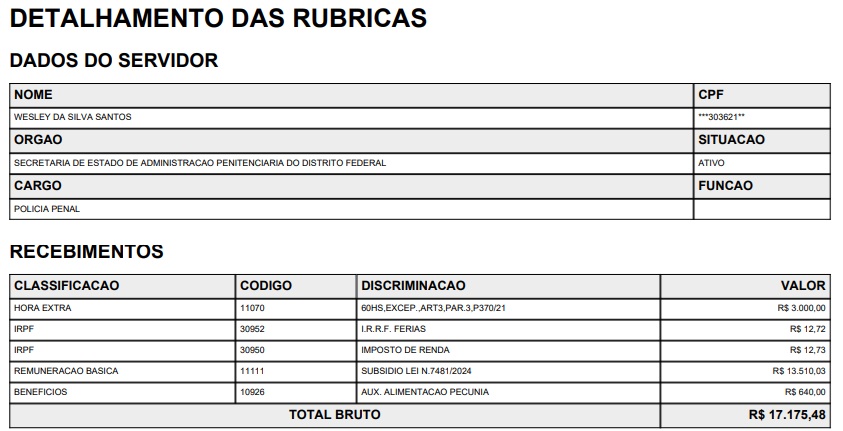 A decisão foi publicada nesta quarta (13) pela Controladoria-Geral do DF na Portaria nº 249/2025, com efeito imediato. O servidor recebia salário bruto de R$ 17.150,03 [líquido de R$ 13.049,83], incluindo horas extras e benefícios.