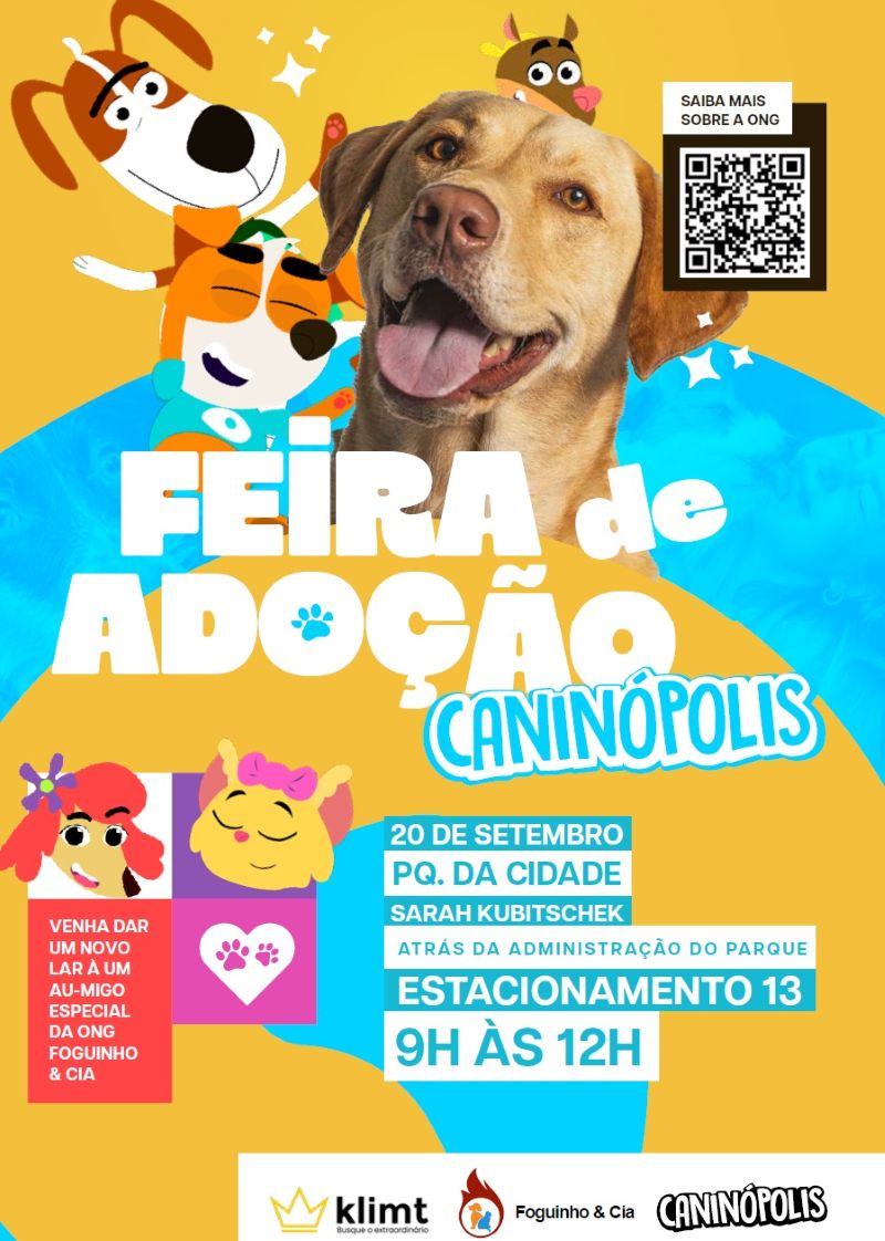 Neste dia 20 de setembro, das 9h ao meio-dia, o Parque da Cidade, no estacionamento 13, vai se encher de amor e diversão com a Feira de Adoção Caninópolis! Adote um pet, doe ração, tire fotos com os personagens mais queridos do YouTube e viva momentos incríveis com a turminha da Caninópolis!