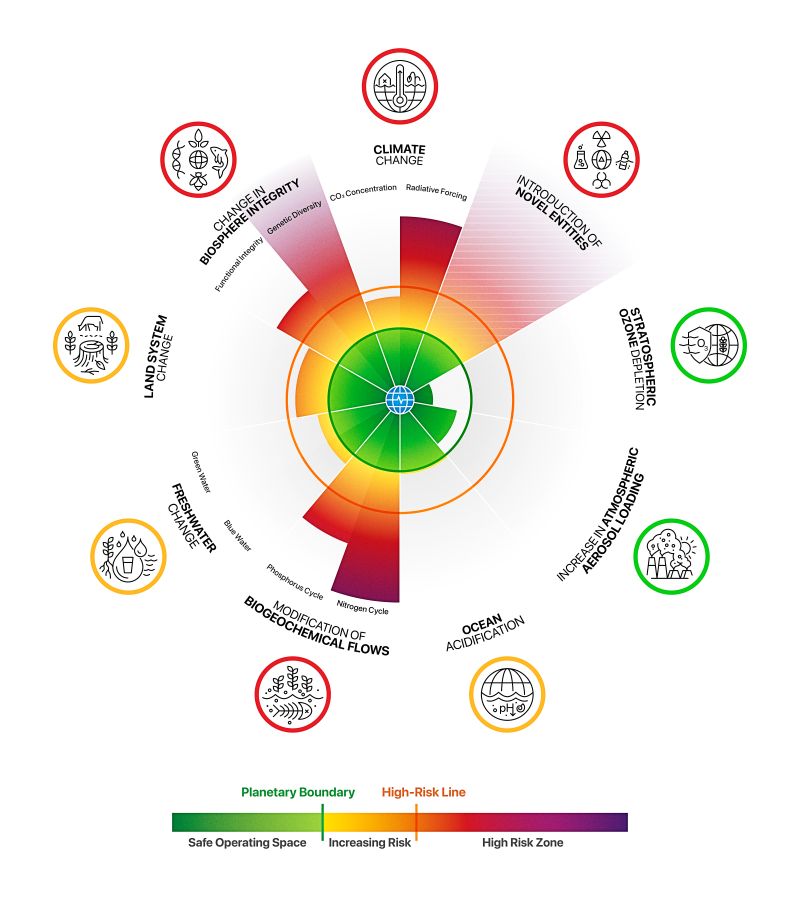 Os nove limites juntos formam o sistema operacional da Terra, os processos interconectados de suporte à vida que devem permanecer dentro de limites seguros para manter a humanidade segura e o mundo natural resiliente. Cientistas monitoram esses limites por meio de medidas importantes, como sinais vitais em um exame de saúde, para monitorar a condição do planeta. As descobertas apontam para uma deterioração acelerada e um risco crescente de mudanças irreversíveis, incluindo um risco maior de pontos de inflexão.