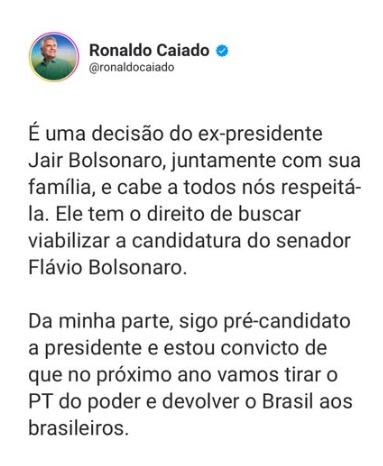 “É com grande responsabilidade que confirmo a decisão da maior liderança política e moral do Brasil, Jair Messias Bolsonaro, de me conferir a missão de dar continuidade ao nosso projeto de nação”, escreveu o senador nas redes sociais.