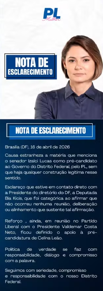 A reação veio de forma imediata. Em nota pública, a ex-primeira-dama Michelle Bolsonaro, que preside o PL Mulher e é apontada como uma das principais lideranças da legenda no DF, afirmou ter causado “estranheza” o anúncio unilateral. Segundo ela, não houve construção interna que sustentasse a iniciativa.